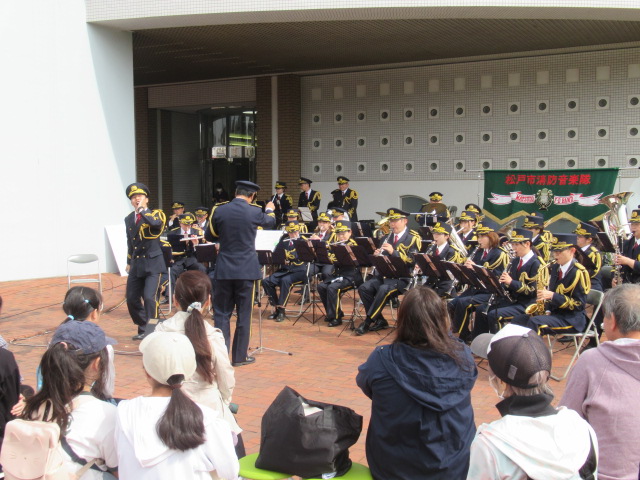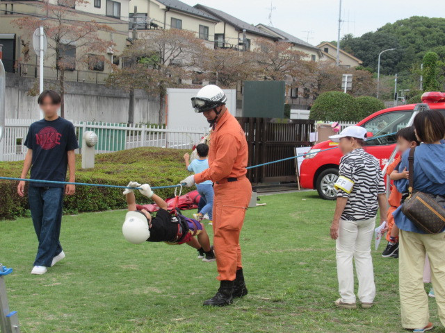松戸市消防署による消防車両展示、「君も消防士」(消防服着用体験)、「こどもレスキュー」(ロープ・モンキー渡り体験)、